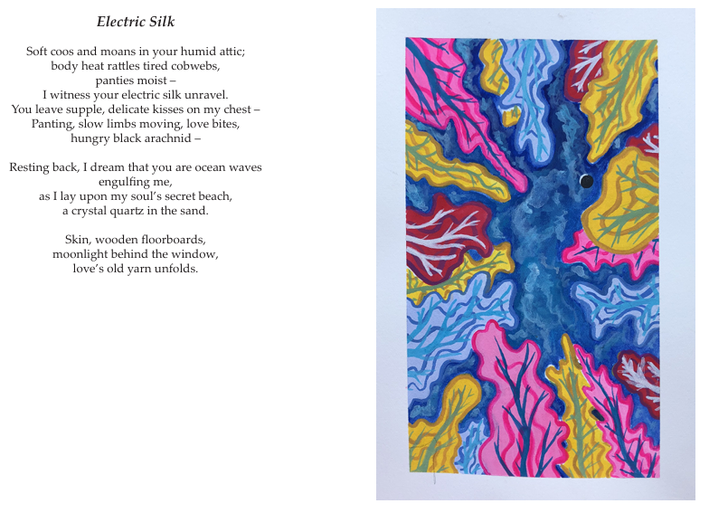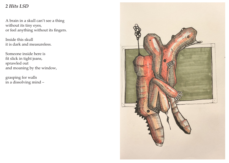 At some point, Ben and I got together with the idea of doing something creative with our individual bodies of work. I brought a pile of poems, and Ben brought his notebooks - and Jack decided to come along for the ride, too. That afternoon we smoked a joint together and then laid out all of our materials on my living room floor — poems on one side, illustrations on the other. We started intuitively pairing pieces from each pile that seemed to belong together. We didn’t have a system for bringing things together, we just felt things based on what made sense. Darker material drifted toward darker images while dreamier, more cerebral poems found their way toward the drawings that held a similar atmosphere.